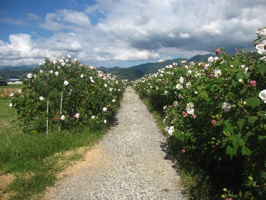 酔芙蓉農道周辺の田んぼはどこも稲刈りが終わっていた。稲藁干しの風景は秋らしいのだが、今日は夏のような暑さ。