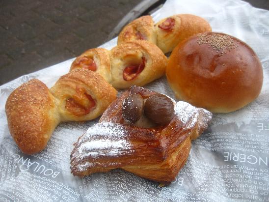 公園のベンチに座り遅い昼食タイム。Bakery innocentで栗のデニッシュとあんぱんとベーコンエピを購入。3つで460円。