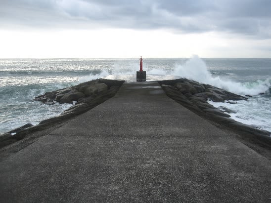 突堤。台風の影響かうねりがあって波が高い。明日の夕方はこの