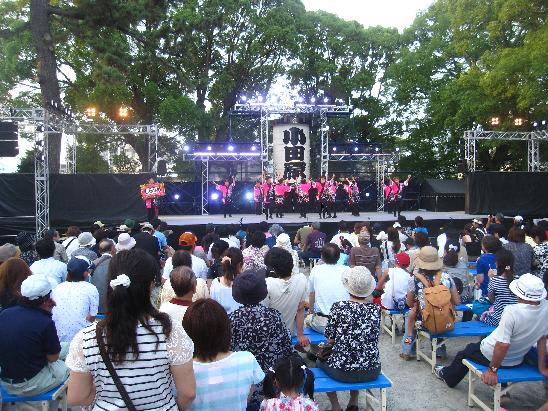 学橋を渡り二の丸広場へ。ステージではちょうちん踊りのコンテストが行われていた。会場は結構な人出で騒々しい。早々に退散。