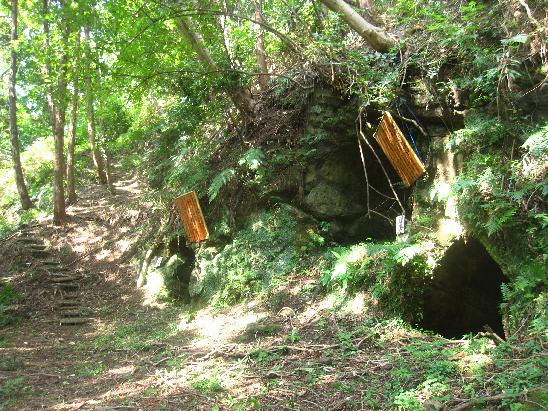 資料BOXから説明資料を手に風外窟へ。南向きの山の斜面に大小いくつかの横穴が開いている。この横穴は