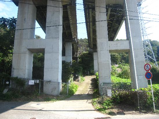 県道72号の小田厚高架下の曽我丘陵側を見ると、上下線の高架の間に細い農道が山へと続いている。その細い農道を進む。