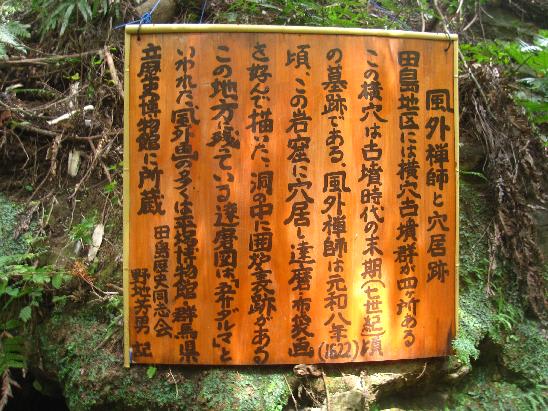 いままで散策の途中などに市内にある色々な史跡に立ち寄っては写真を撮っているが、中には気味が悪く感じ再訪しようと足が向かない場所が何ヶ所かある。そんな場所のひとつが田島にある風外窟で、3年ほど前に一度訪れたが、夕暮れ近い時間だったこともあって、寂しい山の中の崖地に横穴が開いている風外窟