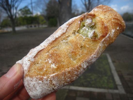 のり塩味のするパン生地の中に甘いうぐいす豆が練りこまれている。豆の甘さがパン生地と良くあっていて焼き目の香ばしさが加わり美味しかった。