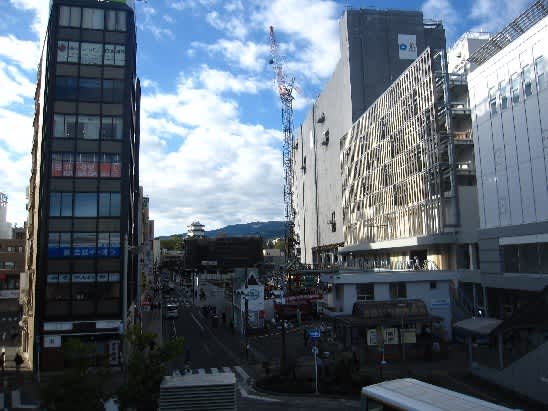 ペデストリアンデッキからお城通り地区の再開発工事現場を撮影。ラスカの立体駐車場建設現場では2階通路部分の柵の設置作業が行われていた。