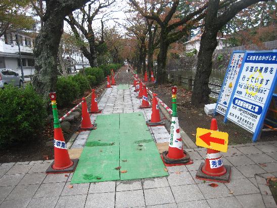 お堀端通り沿いの遊歩道が舗装化された後も未舗装だった三の丸小学校側の遊歩道で現在歩道舗装修繕工事が行われている。10月下旬