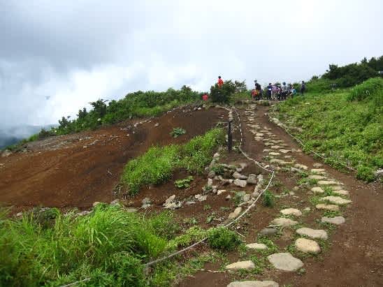 区間に入ると霧がたちこめて涼しい。今週は何度か雨が降ったので登山道のあちこちに白いキノコが生えていた。